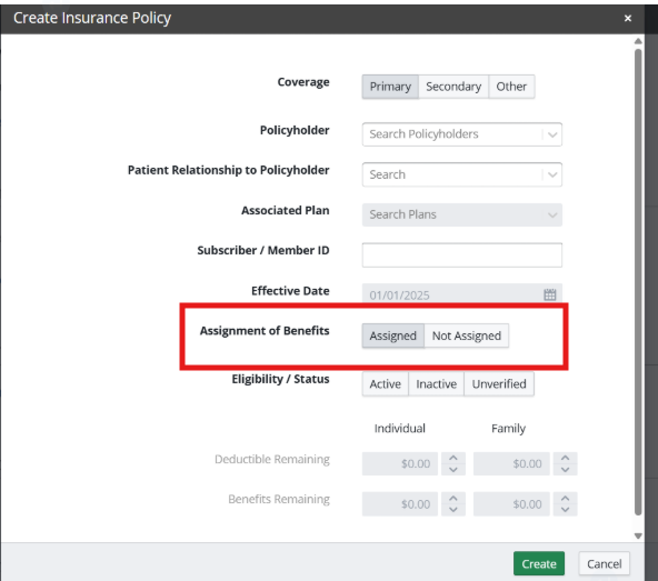 When creating an Insurance Policy and selecting a choice for “Assignment of Benefits”:
